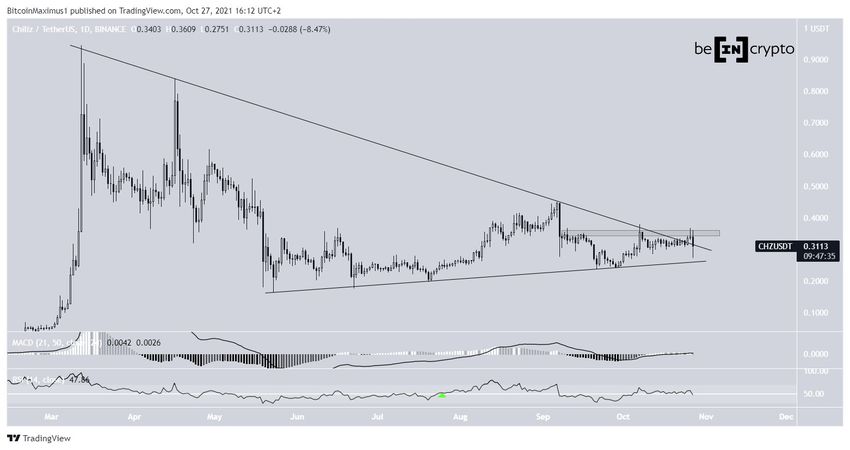 SponsoredCo ważniejsze, CHZ zbliża się do końca formacji trójkąta symetrycznego, który jest tworzony przez wspomnianą linię wsparcia i opadającą linię oporu od marcowego rekordu wszech czasów (ATH).