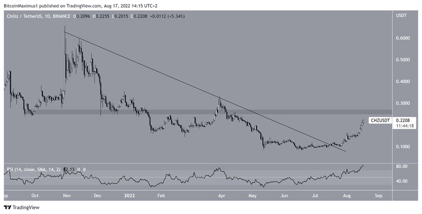 Klin zniżkujący jest uważany za byczą formację, co oznacza, że cena przez większość czasu wybija się z niego. Chiliz wybił się 1 sierpnia i do tej pory osiągnął szczyt na poziomie 0,225 USD w dniu 17 sierpnia.