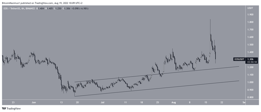 Podobnie jak GNO, EOS wybił się z równoległego kanału wzrostowego 27 lipca. Następnie osiągnął szczyt na poziomie 1,83 USD w dniu 17 sierpnia.