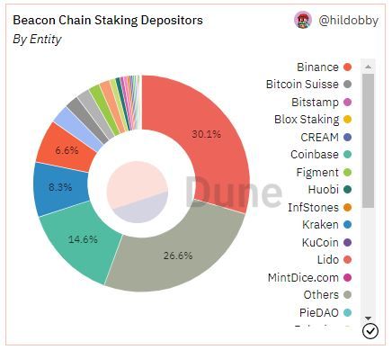 Jednak niektórzy członkowie społeczności kryptowalutowej szybko zwrócili uwagę, że większość mocy walidacyjnej Ethereum jest teraz w rękach zaledwie kilku podmiotów. Dane z Dune Analytics wskazują, że Lido, Coinbase, Kraken i Binance stakują aż 59,6% całkowitego udziału ETH.