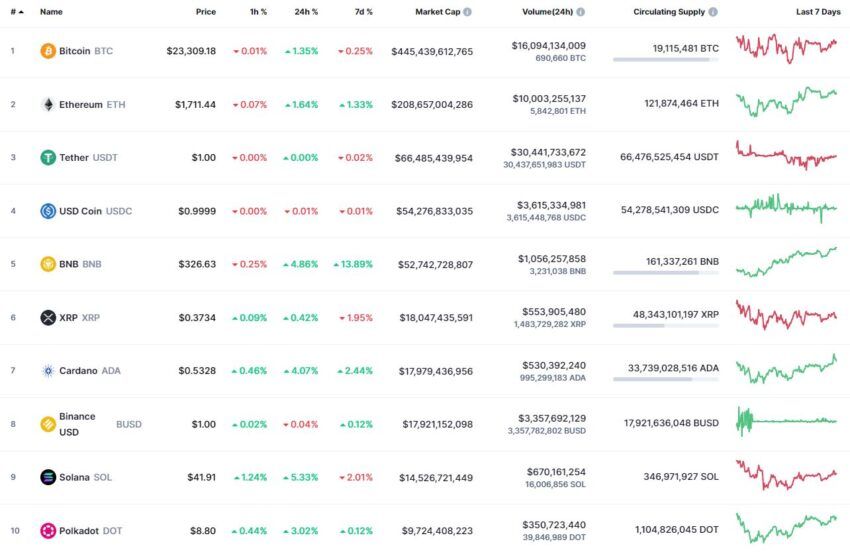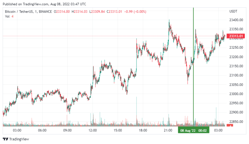 Bitcoin (BTC) według CoinMarketCap rozpoczął nowy tydzień roboczy od ruchu bocznego. Na godzinę 06:47 (MSC), kryptowaluta jest notowana na poziomie 23 313 USD. 24-godzinne minimum monety odnotowano na poziomie 22 930 dolarów, natomiast maksimum na poziomie 23 359 dolarów.