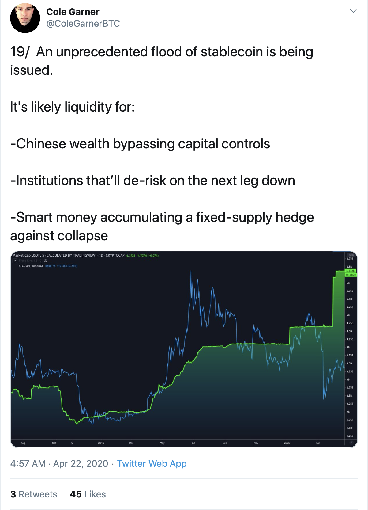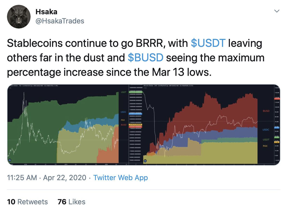 Jednym z autorów takich tez jest Hsaka (@HsakaTrades), który zauważa, że drukowanie pieniędzy przez Tethera jest zarówno niezwykłe, jak i pozostawia innych konkurentów w tyle.