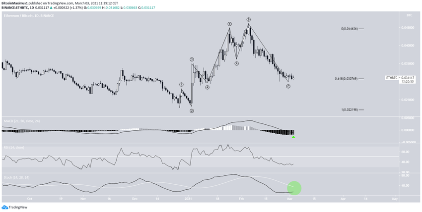 ETH jest obecnie notowane na poziomie zniesienia 0,618 Fib ostatniego ruchu wzrostowego na poziomie 0,03 BTC.