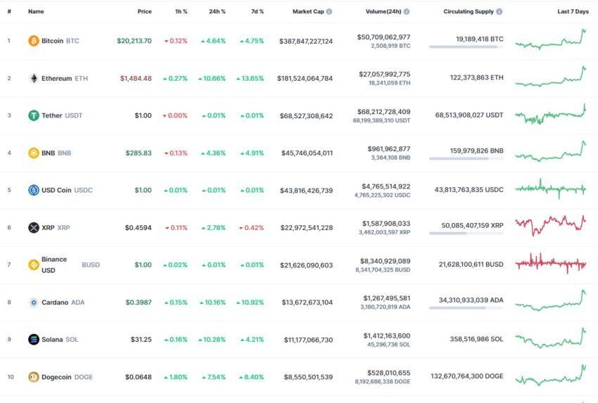 W pierwszej dziesiątce najsilniejszych kapitałowo kryptowalut, wszystkie monety z wyjątkiem XRP, który w ciągu tygodnia stracił 0,42% wartości, wykazały dodatnią dynamikę w ciągu ostatnich 24 godzin i siedmiu dni. Najlepszy wynik w ciągu dnia miało Ethereum (+10,66%). Kryptowaluta ta rosła również aktywniej niż inne w ciągu tygodnia (+13,65%).