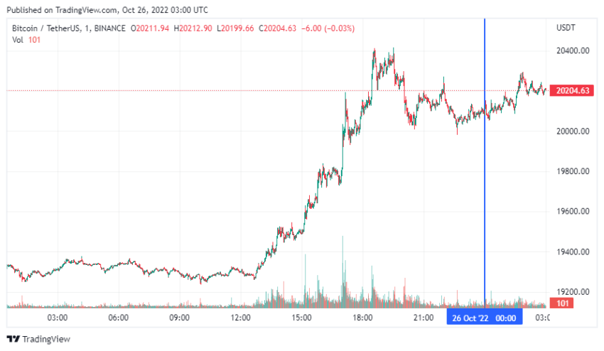 Bitcoin (BTC) rozpoczął środę od niewielkich wzrostów – wynika z danych CoinMarketCap. Na dzień 26 października godzinę 07:01, kryptowaluta jest notowana na poziomie 20 204 USD. Najniższy poziom monety w ciągu 24 godzin to 19 261 dolarów, a najwyższy – 20 348 dolarów.