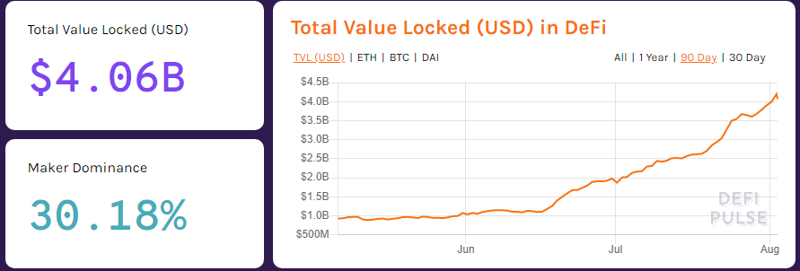 Zainteresowanie sektorem DeFi gwałtownie rośnie od kilku miesięcy. Najlepiej ilustruje to rosnący popyt, który możemy zobaczyć patrząc na całkowitą wartość zablokowaną w DeFi (TVL). Od czasu, gdy na przełomie maja i czerwca TVL przekroczył 1 miliard dolarów, zaczął rosnąć w błyskawicznym tempie. Aktualnie, według danych z serwisu defipuls, TVL wynosi około 4 miliardów dolarów.