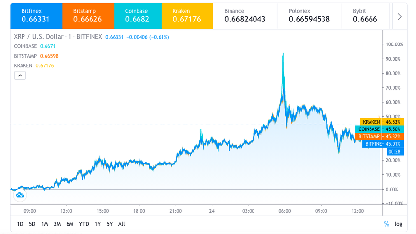 Najwyraźniej było to napędzane przez użytkowników Coinbase, ponieważ cena XRP nie osiągnęła tego samego poziomu na innych giełdach. Na przykład Bitfinex, Bitstamp i Kraken zanotowały liczby nie wyższe niż 0,80 USD w tym samym czasie.