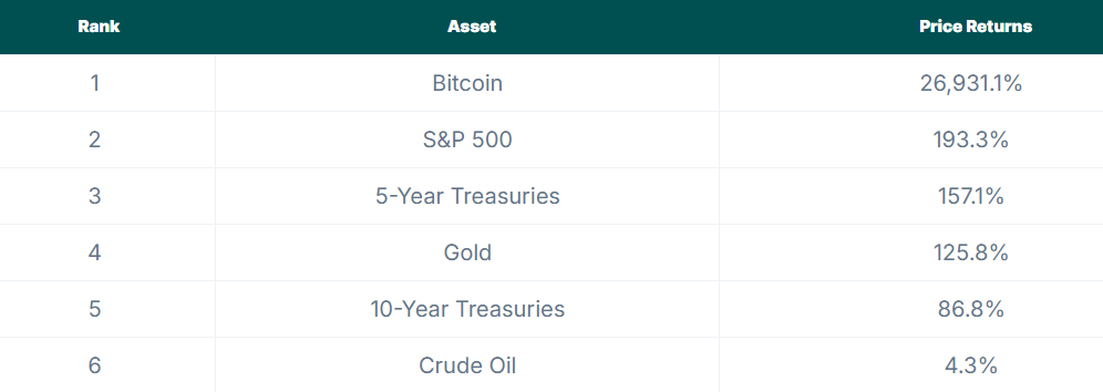 Raport ujawnia zatrważająco większe zwroty Bitcoina w porównaniu do złota, akcji i obligacji skarbowych USA.