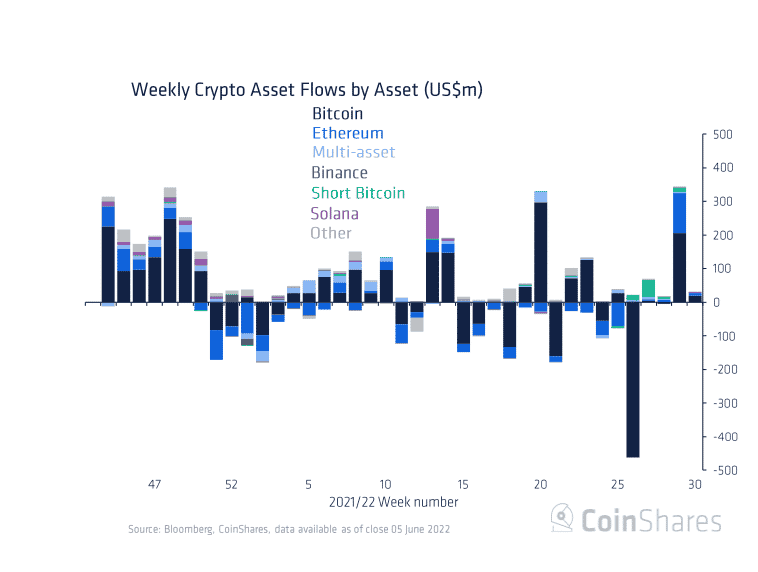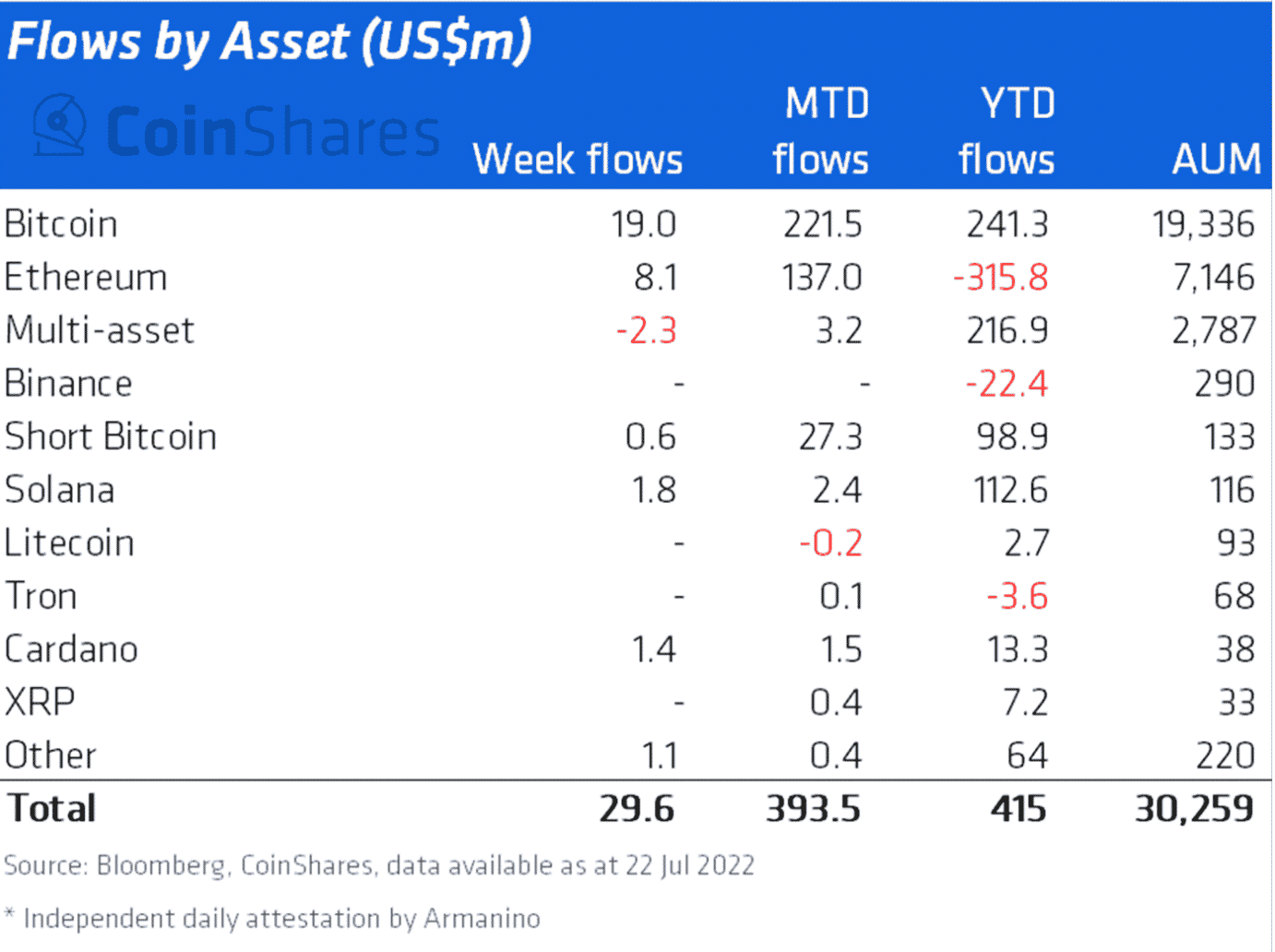 SponsoredWedług CoinShares 30 mln USD zostało zgłoszonych jako wpływy do produktów inwestycyjnych aktywów cyfrowych w zeszłym tygodniu. Daje to całkowite wpływy od początku miesiąca w wysokości 394 mln USD. Natomiast całkowite aktywa pod zarządzaniem (assets under management, AuM) wróciły do wartości z początku czerwca 2022 roku na poziomie 30 mld USD.