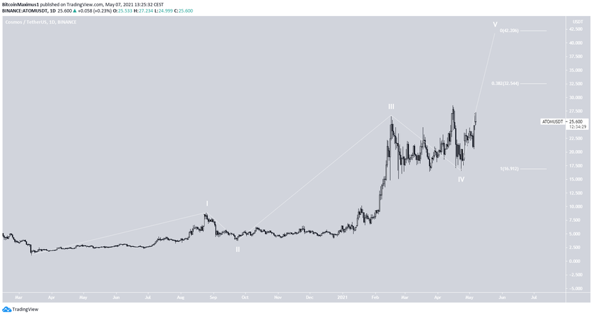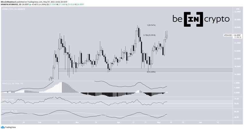 ATOM rośnie od dnia 23 kwietnia, kiedy odbił się w obszarze wsparcia na 17 USD. Jak dotąd udało mu się osiągnąć szczyt na 27,18 USD, tuż poniżej ATH o wartości 28,50 USD.