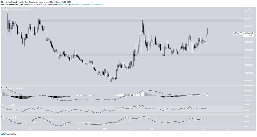 Wykres ATOM/BTC jest również byczy. Porusza się w górę od dnia 13 marca, kiedy odzyskał obszar 3200 satoshi, potwierdzając go jako wsparcie.