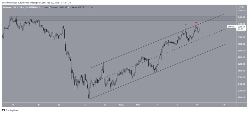 Podobnie jak BTC, Ethereum (ETH) wzrasta wewnątrz wznoszącego się kanału równoległego od dnia 24 stycznia.