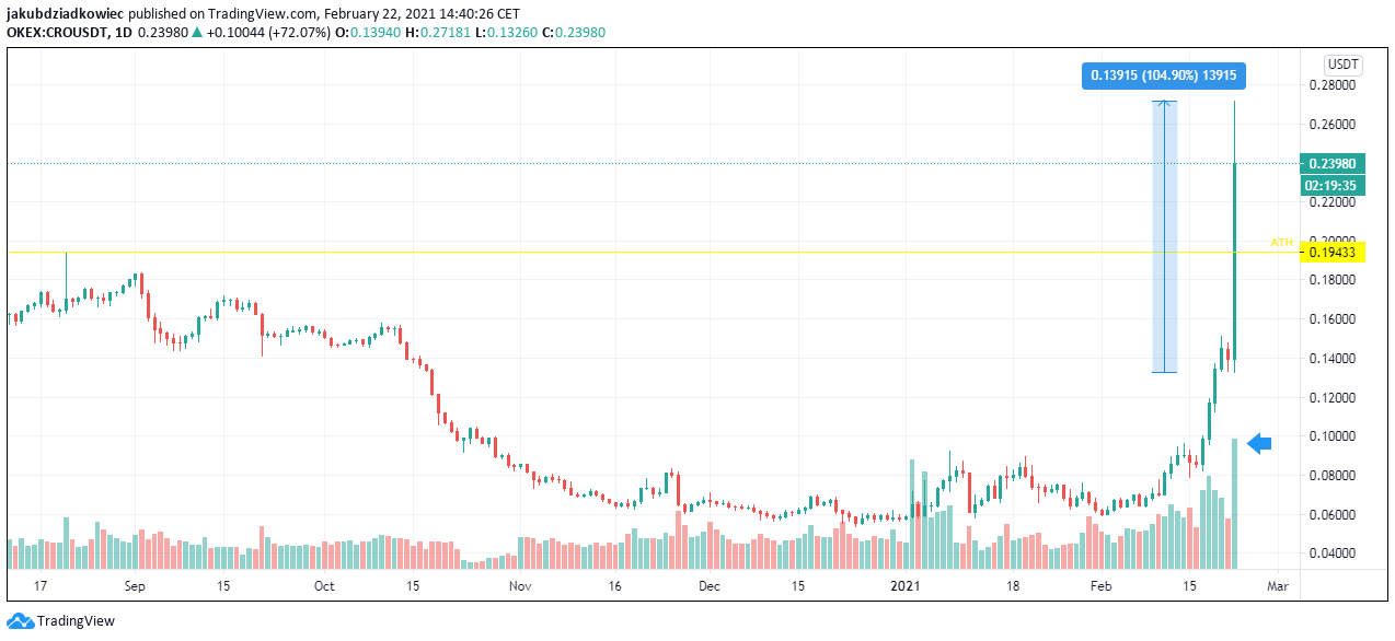 Od wczorajszych godzin porannych cena CRO wzrosła o 105%, w zaledwie 6 godzin wybijając się z obszaru 0,13 USD do poziomu 0,27 USD na szczycie knota. Wzrost został potwierdzony wybiciem w wolumenie (niebieska strzałka). Cena przebiła poprzedni rekord wszech czasów (ATH – żółta linia) o wartości nieco ponad 0,19 USD z dnia 21 sierpnia 2020 roku.