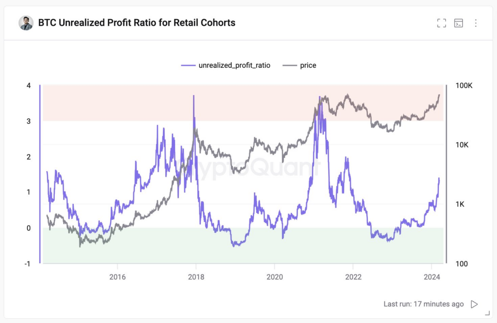 Zwykle osiągamy te szczyty cenowe, gdy wskaźnik niezrealizowanych zysków (fioletowa linia na powyższym wykresie) wchodzi w czerwoną strefę.