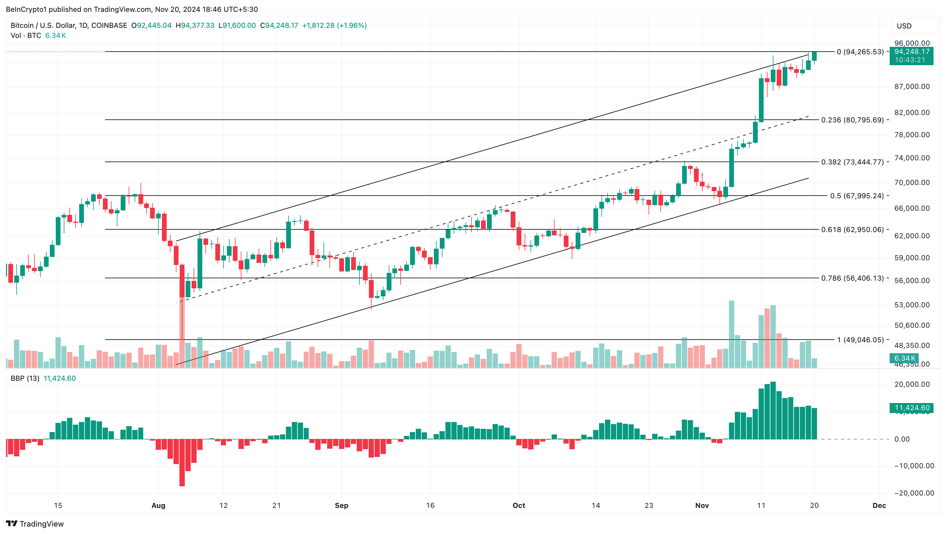 W momencie publikacji, cena Bitcoina wynosi 94 248 USD i handluje się w rosnącym kanale. Wskaźnik Bull Bear Power (BBP), który mierzy siłę kupujących w porównaniu do sprzedających, również znajduje się w pozytywnym regionie.