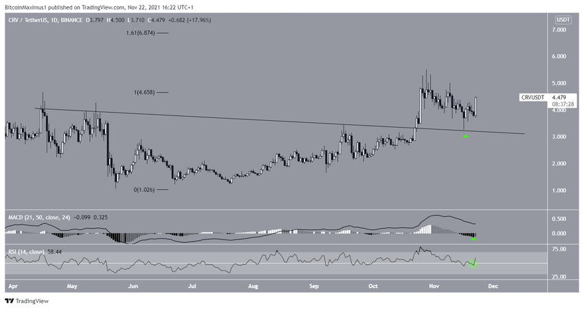 W tygodniu 15-22 listopada Curve DAO utworzył długi dolny knot. Jest to uważane za oznakę presji zakupowej. Co ważniejsze, pojawił się on tuż powyżej horyzontalnego obszaru przy 3,60 USD. Ten sam obszar działał jako opór w okresie wrzesień 2020 – październik 2021. Dlatego też wybicie ponad ten obszar i jego późniejsza walidacja jest niezwykle byczym znakiem. Oczekuje się teraz, że obszar ten będzie stanowił wsparcie.