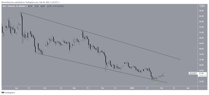 Od 6 września NEO handluje wewnątrz opadającego klina, co doprowadziło do najniższego poziomu 16,11 USD w dniu 24 stycznia. Odbicie (zielona ikona) posłużyło do potwierdzenia linii wsparcia klina.