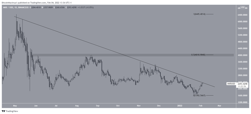 Podobnie jak XTZ, MKR podążał za opadającą linią oporu, odkąd 3 maja osiągnął ATH, prowadząc do minimum 1620 USD 22 stycznia.