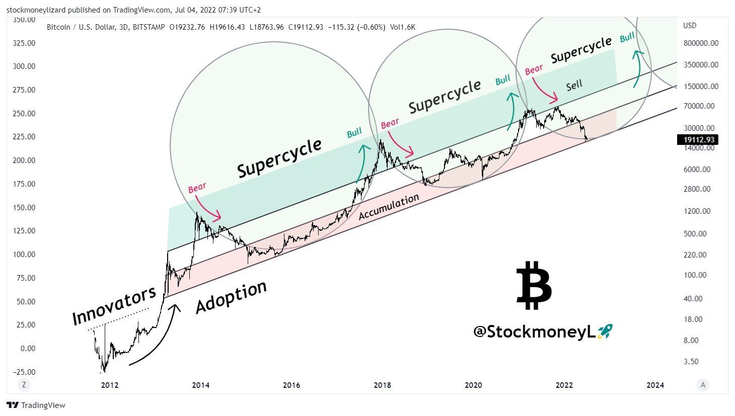 Ponadto zdaniem autora istnieje przerywana linia „wielkiego wsparcia” („grand support”). Na niej kończą się spadki kolejnych cyklów Bitcoina od ery tzw. „Innowatorów” z okresu 2011-2013. Według tej interpretacji aktualna cena BTC znajduje się dokładnie na linii wsparcia i może być sygnałem dla makro dołka ceny BTC.