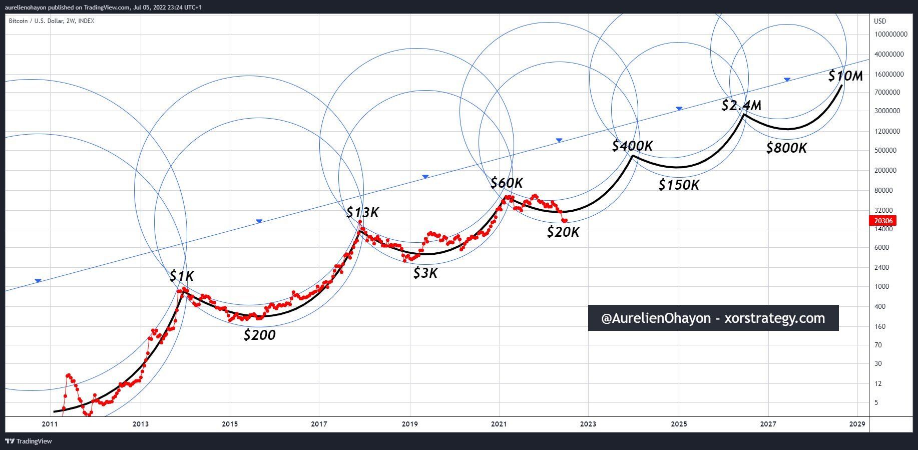 Również w tej wersji aktualna cena BTC oscylująca w okolicach 20 000 USD jest interpretowana jako obszar makro dołka dla bieżącego cyklu. Co więcej, model zawiera prognozy na kolejne 3 cykle. Pod koniec 2024 roku Bitcoin ma osiągnąć 400 000 USD. Następnie w połowie 2026 roku aż 2,4 mln USD, aby dosięgnąć 10 mln USD w 2028 roku. Gdyby tak się stało, to cykle Bitcoina z pewnością uległyby skróceniu.