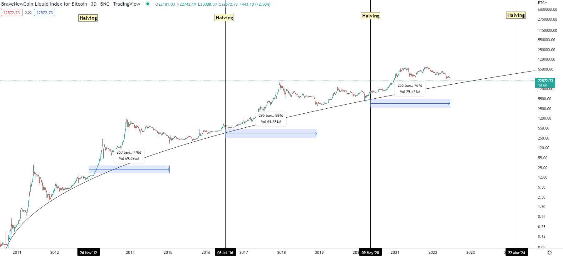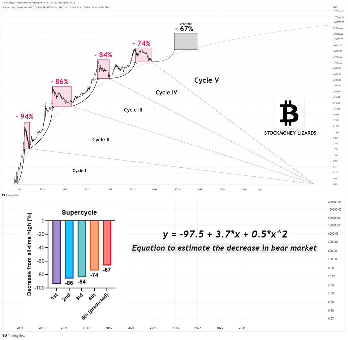 Nowością w tym modelu jest próba stworzenia algorytmu dla dokładnego wyliczenia głębokości spadków w trakcie rynków niedźwiedzia. Analityk czyni to nie tylko dla aktualnego cyklu, ale również próbuje przewidzieć kolejny, który ma nastąpić w latach 2023-27.