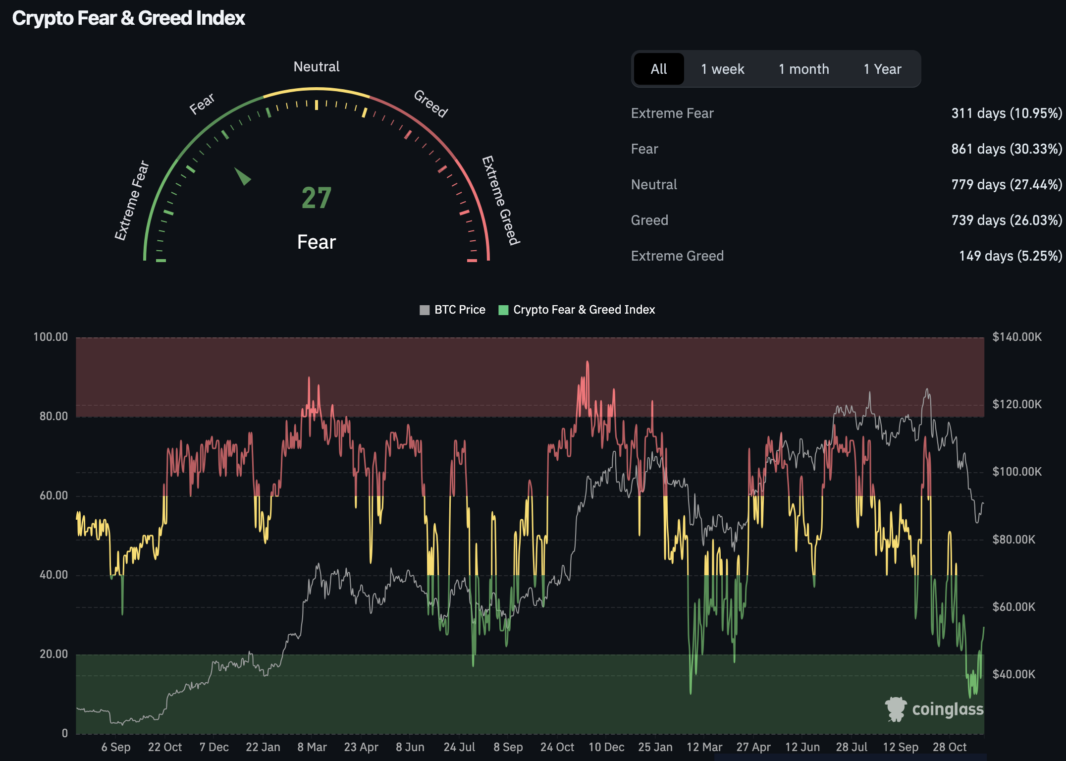 W tym miejscu kluczową rolę odgrywa indeks strachu i chciwości. To jedno z najważniejszych narzędzi do oceny emocji rynku. Łączy on dane o zmienności, wolumenie i trendach społecznych. Obecnie indeks strachu i chciwości dla rynku krypto wynosi 27. Tak wynika z danych Coinglass. Ten poziom oznacza wyraźną strefę strachu.