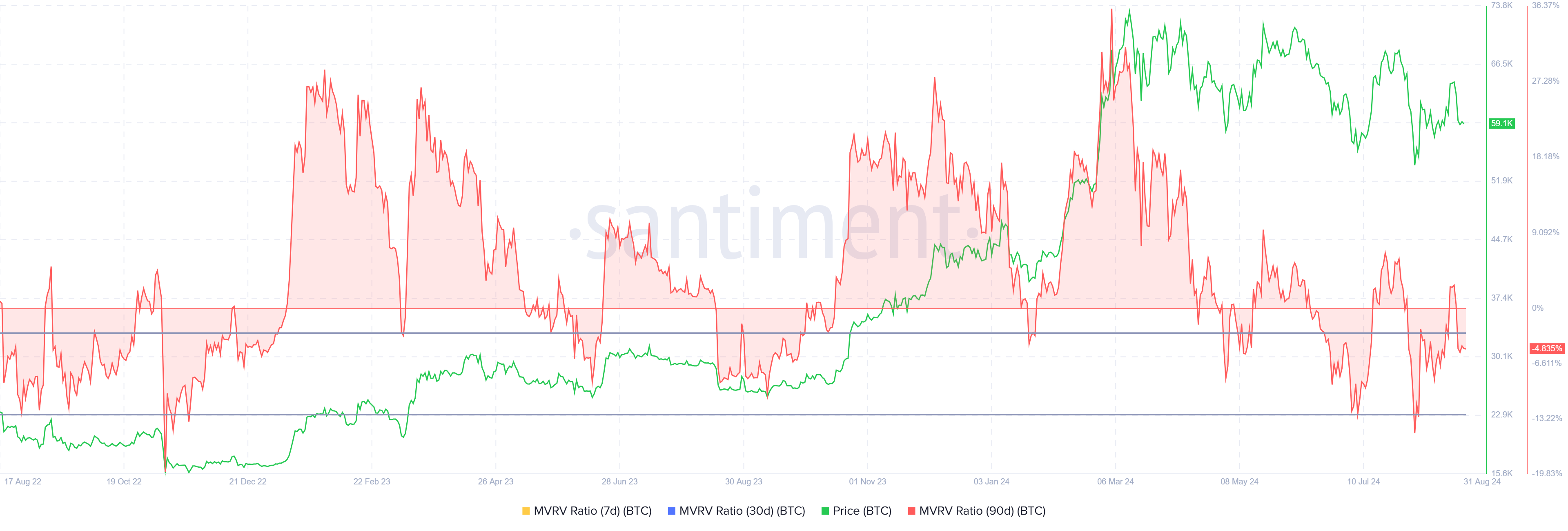 Historycznie rzecz biorąc, MVRV Bitcoina między -2% a -12% sygnalizowało początek ożywienia i rajdów. Przypadki te odnotowano w połowie czerwca 2023 r., na początku października 2023 r., a ostatnio na początku lipca tego roku.