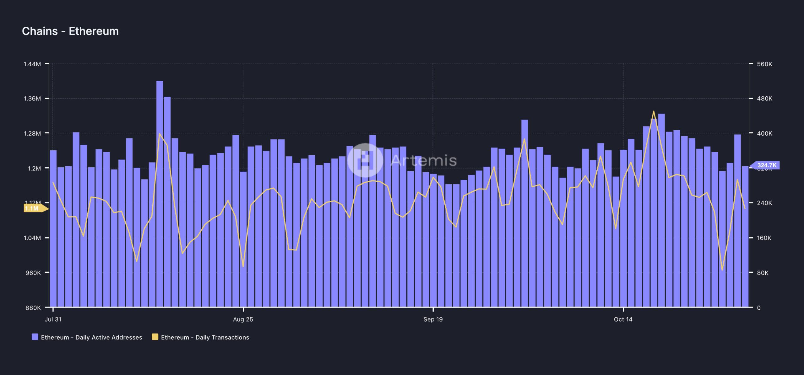 Słaby wzrost TVL Ethereum odzwierciedla niski popyt na sieć w ostatnim miesiącu. Dane z Artemis pokazują, że liczba dziennych aktywnych adresów on-chain wyniosła 324 745 w ciągu ostatnich 30 dni. Jest to spadek aż o 25%.