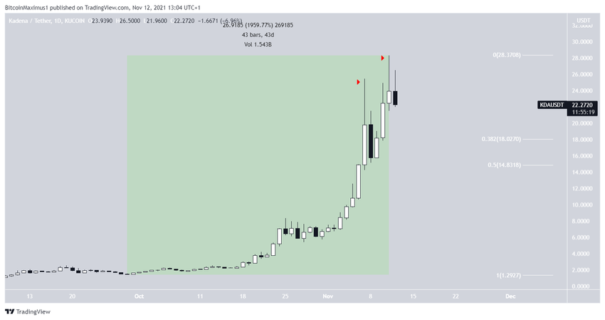 KDA rośnie w przyspieszonym tempie od 29 września. W ciągu 43 dni przesunął się w górę o 1,952%. Doprowadziło to do nowego ATH 28,30 USD 10 listopada.