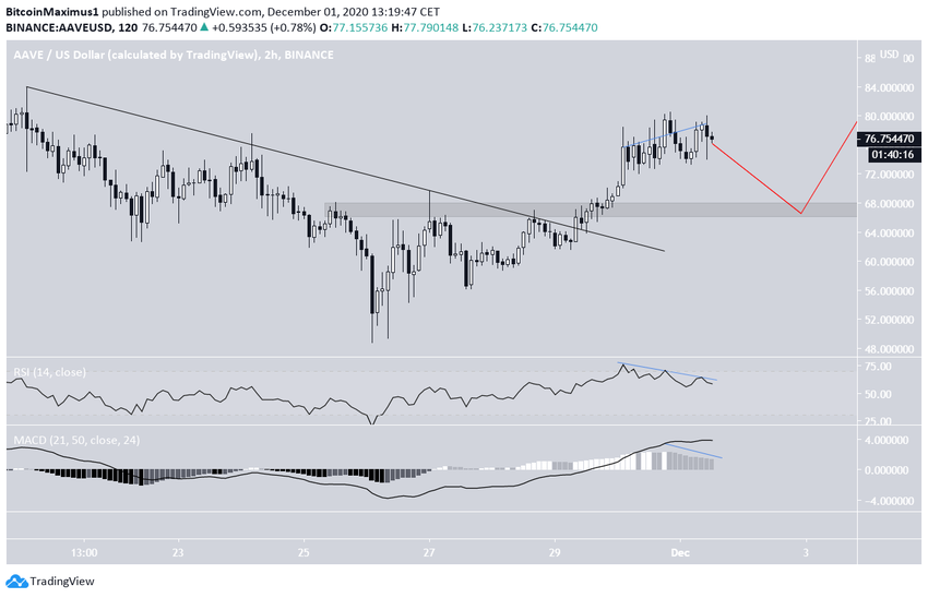 Krótkoterminowy wykres dla AAVE pokazuje, że cena wybiła się z opadającej linii oporu. Jednak spowodował znaczną niedźwiedzią dywergencję zarówno na RSI, jak i MACD.