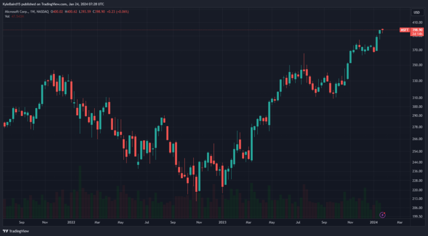 Akcje MSFT odnotowały długoterminowe minimum na poziomie 220 USD w 2023 r., ale od tego czasu silnie rosną i niedawno zamknęły tydzień na rekordowym poziomie, nieco poniżej 400 USD. Nie jest wykluczone, że w tym tygodniu akcje jeszcze wzrosną.