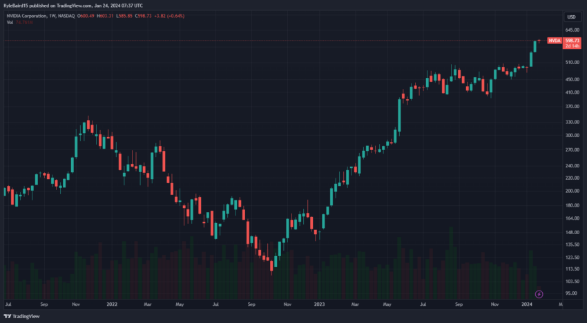 SponsoredNVDA podążała podobną trajektorią jak MSFT. Akcje osiągnęły lokalne dno na poziomie 113 USD w październiku 2022 r. i od tego czasu wzrosły o ponad 400% bez większych korekt. Niektórzy analitycy przewidują, że Nvidia może wkrótce przeprowadzić podział akcji po raz szósty w historii firmy.