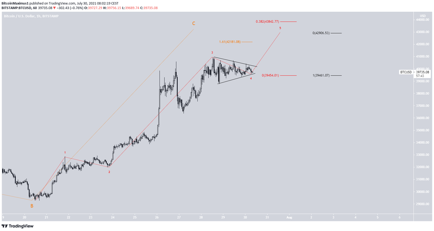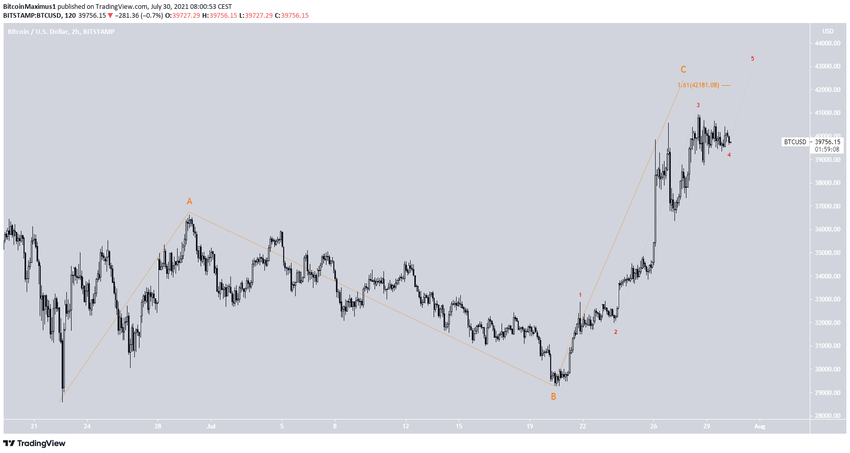 Liczba fal nadal sugeruje, że BTC znajduje się w fali C struktury korekcyjnej A-B-C. Najbardziej prawdopodobnym celem dla szczytu tego ruchu jest poziom 42 181 USD. Dałoby to falom A:C stosunek 1:1,61.