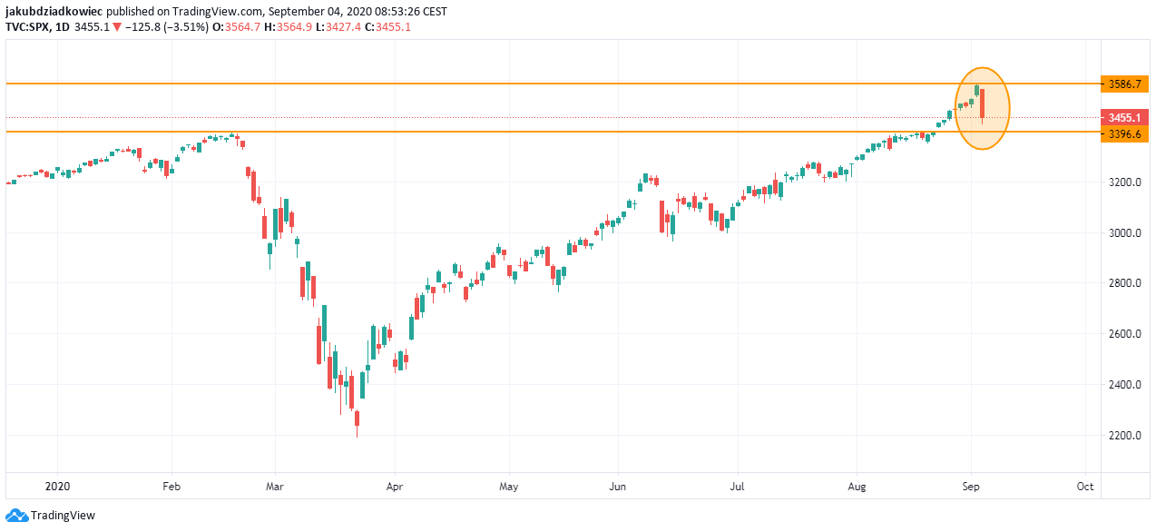 Jedną z możliwych przyczyn nagłego spadku Bitcoina jest obserwowane od dłuższego czasu powiązane z tradycyjnym rynkiem akcji. Indeks S&P 500 przebił w ubiegłym tygodniu swoje ATH w obszarze 3 400 USD i w dniu 2 września osiągnął nowe ATH na poziomie 3 588 USD. Jednak w dniu wczorajszym index pięciuset przedsiębiorstw o największej kapitalizacji odnotował duży spadek rzędu 4%.