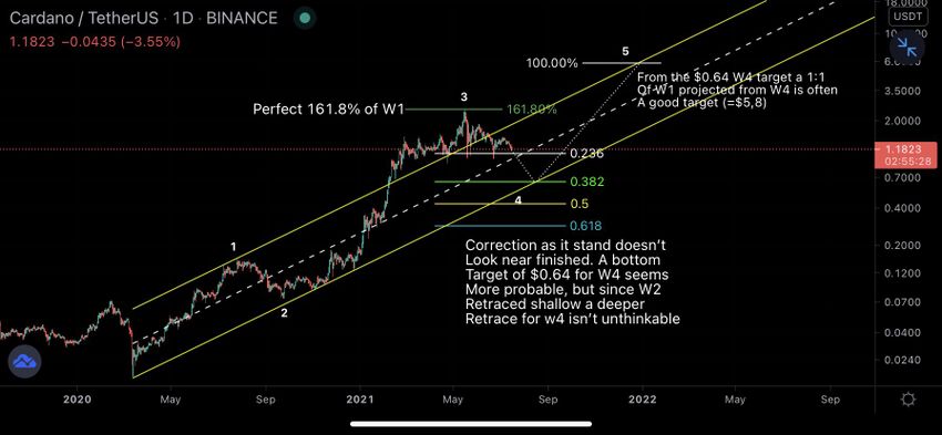 Trader kryptowalutowy @Mesawine1 nakreślił wykres ADA, stwierdzając, że spodziewany jest kolejny spadek, który zakończyłby falę czwartą.