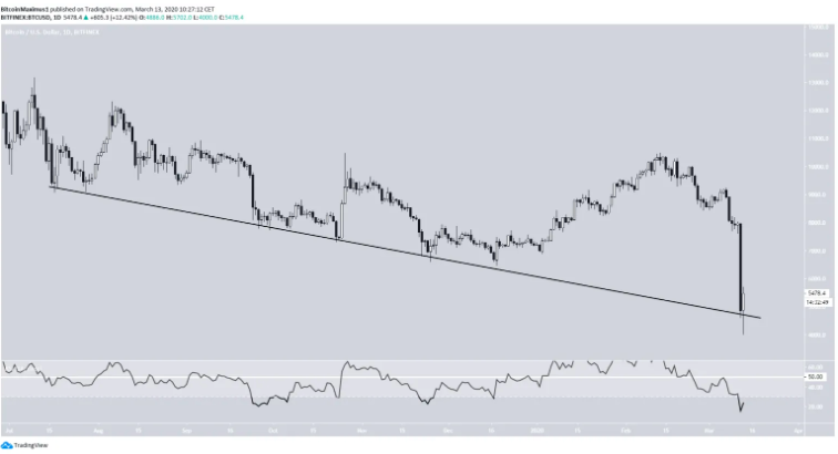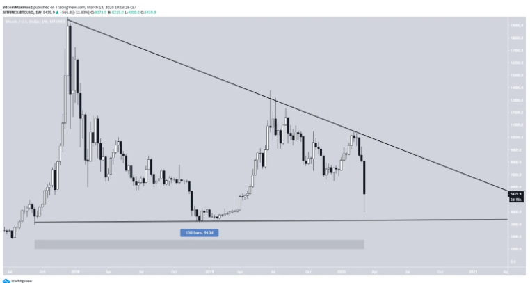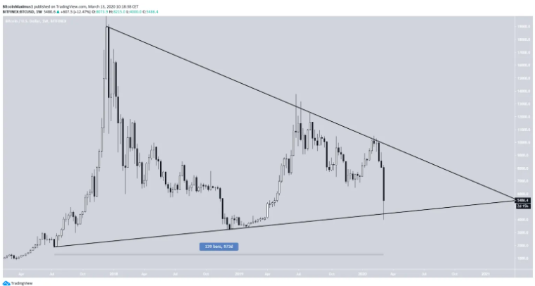 Dobrze znany trader @PostyXBT nakreślił wielki spadający trójkąt dla ceny BTC, z linią oporu zaczynającą się na All Time High z grudnia 2017 oraz linią wsparcia ustawioną na 3 300 USD i dotykającą najniższych poziomów z 2018 roku.
