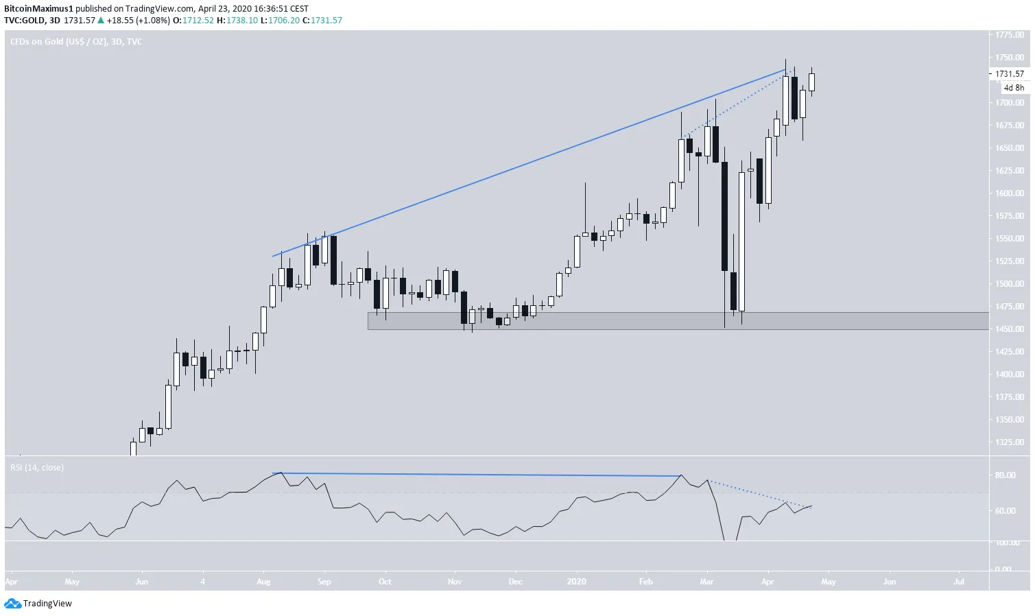 Cena osiągnęła najniższy poziom 1451 USD 16 marca i od tego czasu rośnie. Chociaż cena spowodowała powstanie kilku byczych świec, wykazała też silne oznaki słabości. W trzydniowym RSI powstaje znaczna rozbieżność sygnałów niedźwiedzich w dwóch oddzielnych przypadkach. Sugeruje to, że cena prawdopodobnie spadnie w najbliższej przyszłości, prawdopodobnie potwierdzając raz jeszcze obszar wsparcia 1450 USD.