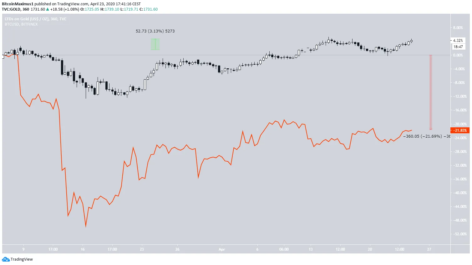 Dlatego powrót złota było znacznie szybszy niż w przypadku BTC, ponieważ cena osiągnęła już nowy najwyższy poziom w porównaniu z marcem.