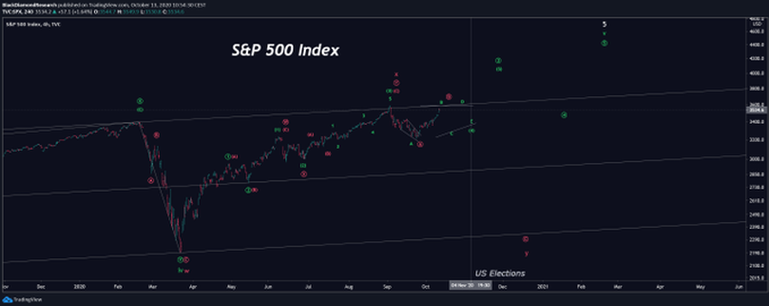 Kryptowalutowy trader @TradingSurfers przedstawił wykres SPX, na którym spodziewa się wzrostu ceny do 2021 roku.