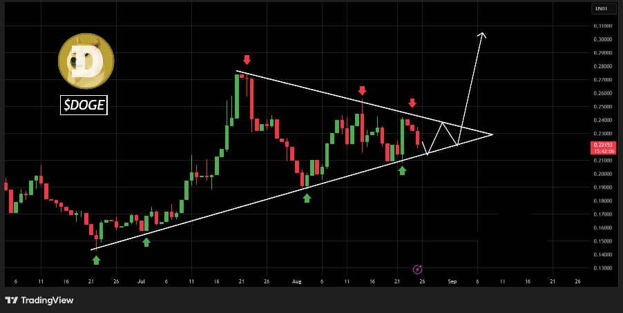„DOGE zbliża się do ostatecznego wybicia. Dogecoin konsoliduje się w ramach tej symetrycznej formacji trójkąta. Cena zbliża się obecnie do punktu szczytowego, blisko wybicia ze struktury.”