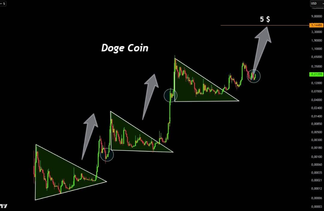 Symetryczny trójkąt tworzy się, gdy cena porusza się w coraz węższym zakresie między dwiema zbieżnymi liniami trendu. Bliskość wierzchołka sugeruje, że DOGE w końcu wybije, a prognozowany cel wynosi 5 USD.