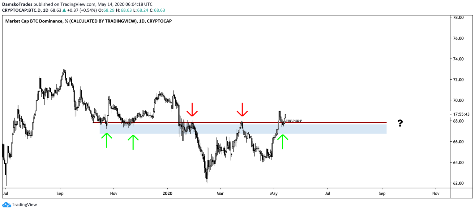 W nieco dłuższej perspektywie BTCD podąża po malejącej linii oporu od września 2019 r. W momencie pisania tego tekstu cena była w trakcie walidacji po raz piąty. Wcześniej 7 maja przekroczył tę linię, ale spadł tuż pod nią.