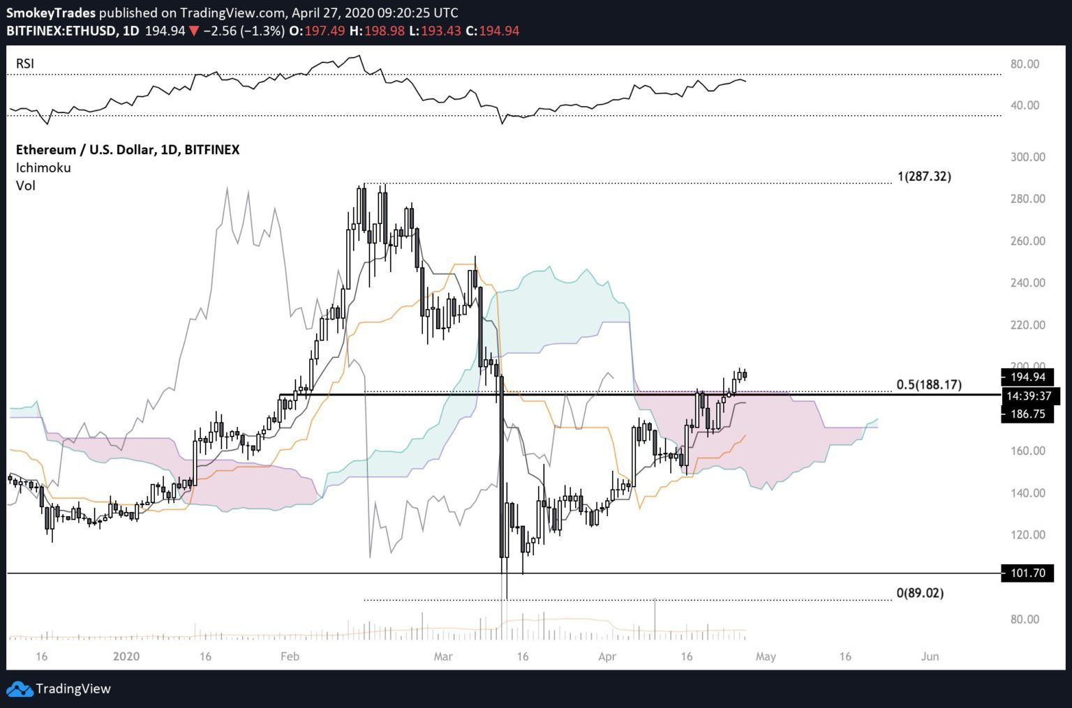 Ruch w górę po osiągnięciu dna z 13 marca przybrało formę rosnącego klina. Trader kryptowalut @TraderSmokey nakreślił wspomniany wyżej zakres handlu dla Ethereum, pokazując, że cena właśnie wzrosła powyżej poziomu 0,5.