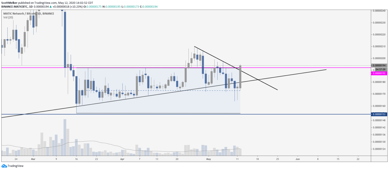Jednym z takich altcoinów jest MATIC, który zaczął nieco spokojniejszy ruch w górę 13 maja. Dobrze znany trader kryptowalut @Scottmelker opublikował tweeta z wykresem MATIC, który pokazuje cenę przekraczającą ważną linię krótkoterminowego oporu.