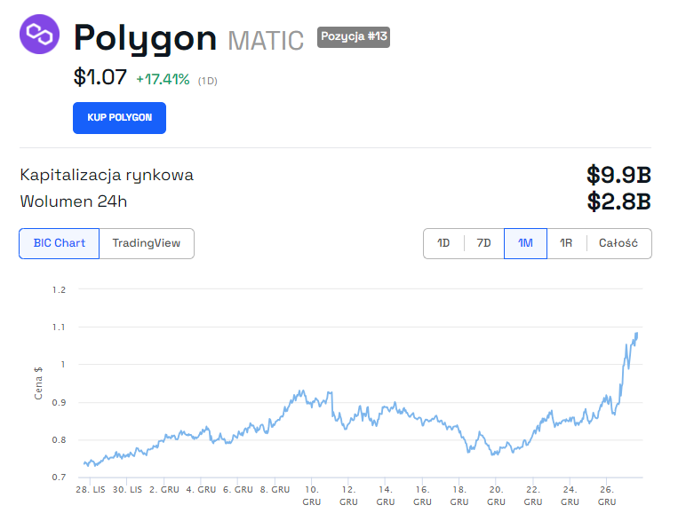 W chwili publikacji, MATIC wyceniony jest po cenie 1,045 USD, co oznacza wzrost o 17,97% w ciągu ostatnich 24 godzin. To imponujące wyniki, zwłaszcza w kontekście wzrostu o 34,37% w ciągu ostatnich siedmiu dni i aż o 40,57% w ujęciu miesięcznym.