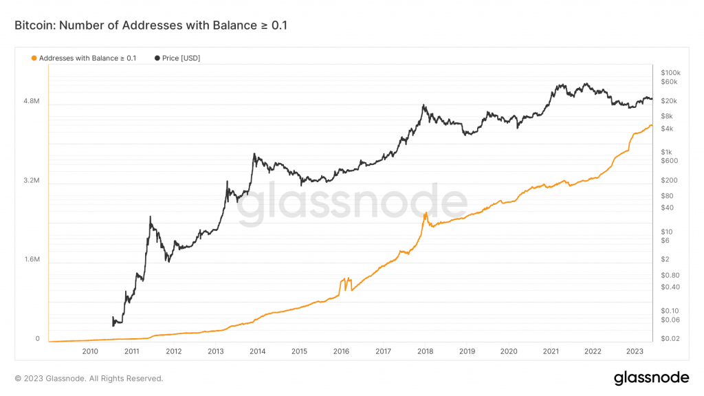 Na przykład liczba adresów z saldem przekraczającym 0,1 Bitcoina przekroczyła 4,3 miliona, zgodnie z danymi Glassnode. Oznacza to, że w samym blockchainie istnieje ogromna ilość podmiotów, które posiadają Bitcoiny o wartości co najmniej kilku tysięcy dolarów.