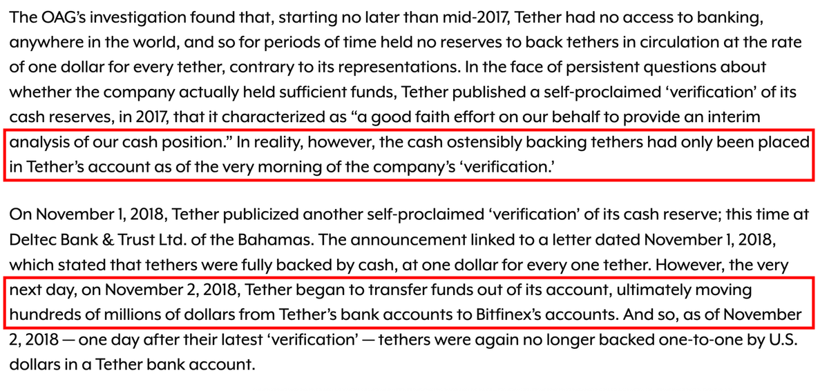 W swoim najnowszym wątku użytkownik opisuje powtarzający się schemat działań Tethera, który może budzić niepokój. Firma nie przeprowadziła żadnego pełnego, niezależnego audytu od lat. Zamiast tego publikuje tzw. „atestacje”, które nie są potwierdzone przez niezależnych biegłych rewidentów. Co więcej, w przeszłości Tether był już karany za ukrywanie faktów, m.in. przez prokuraturę stanu Nowy Jork oraz amerykańską komisję CFTC.