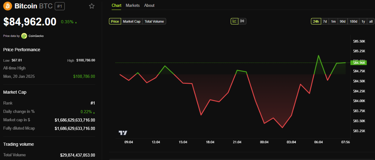 Dane od BeInCrypto pokazują, że Bitcoin był notowany po 84 962 USD w momencie pisania, co oznacza wzrost o skromne 0,35% w ciągu ostatnich 24 godzin.