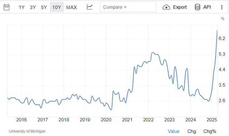 „Pesymizm konsumentów dotyczący przyszłej inflacji osiągnął nowy szczyt od 1981 roku, z oczekiwaniami skaczącymi do 6,7% w kwietniu z 4,9% w poprzednim miesiącu. Zaledwie trzy miesiące temu konsumenci przewidywali inflację na poziomie 3,3% na następny rok.”