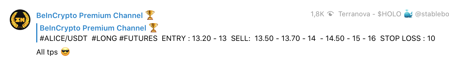 Poniżej jeszcze inny przykład darmowego sygnału dla par ALICE/USD. On również zakończyły się pełnym sukcesem: